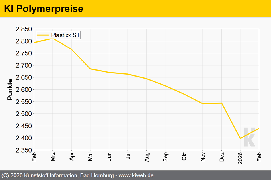 PET: Die Entwicklung im europäischen PET-Markt setzte im Februar 2026 die Tendenz des Vormonats fort. Weiterhin verzögerten sich Importlieferungen. Die Unsicherheiten wegen des sich offenbar aufschaukelnden Konflikts zwischen den USA und dem Iran und der sehr zurückhaltenden Signale aus dem chinesischen Markt veranlassten viele Abnehmer zu weiteren Lagerkäufen – trotz der anhaltenden Baisse der Endmarkt-Nachfrage. Für diese Käufe standen weitgehend nur europäische Waren in begrenztem Umfang zur Verfügung. In der Folge zogen die Notierungen für größere Mengen etwas stärker an als die für kleine Mengen. Der Februar-Kontrakt für Paraxylol in Europa stieg um 10 EUR/t. Unabhängig davon herrscht weiterhin Besorgnis über mögliche Verwerfungen in der PET-Versorgung. Es wird wohl bei gesteigerten Lagerkäufen bleiben, da bislang nicht alle Wünsche durch die europäische Produktion erfüllt werden konnten. Es ist von weiter zumindest moderat ansteigenden Notierungen auszugehen.
